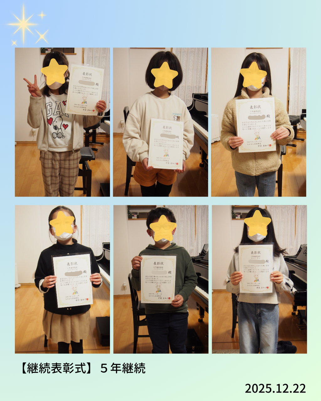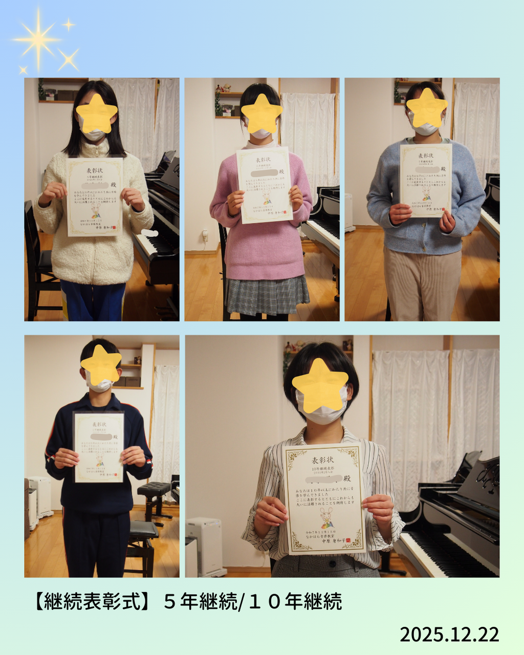 5年継続は2019年7月~2020年12月に入会した生徒さん10名前回の発表会時期からの計算なので期間がちょっと長めですが、10名という人数も嬉しいです😊